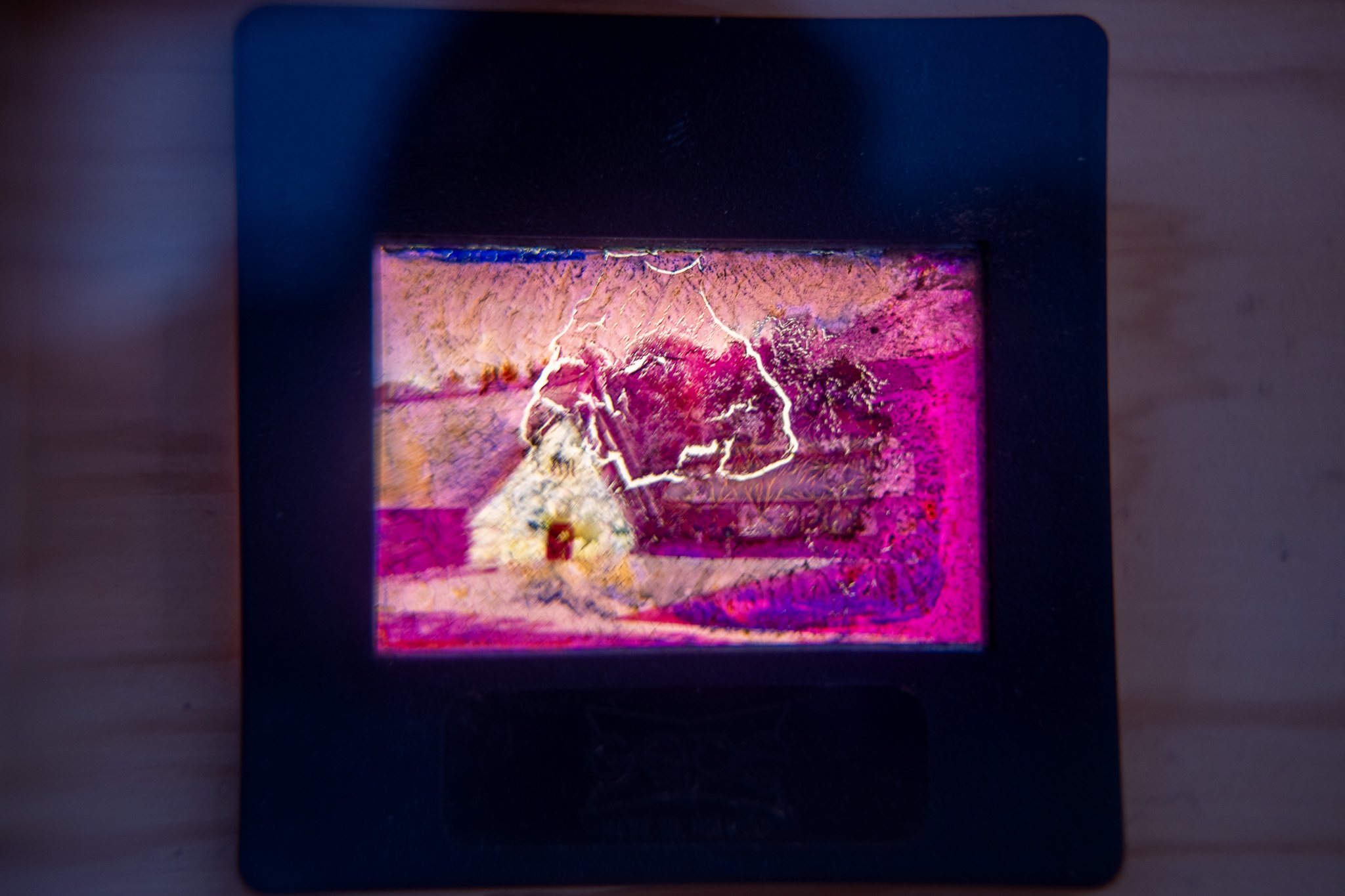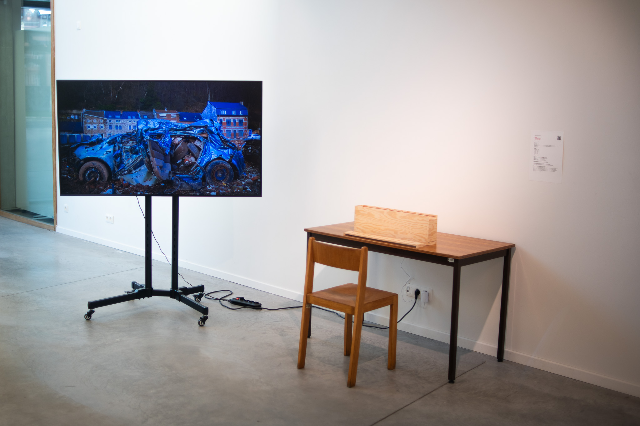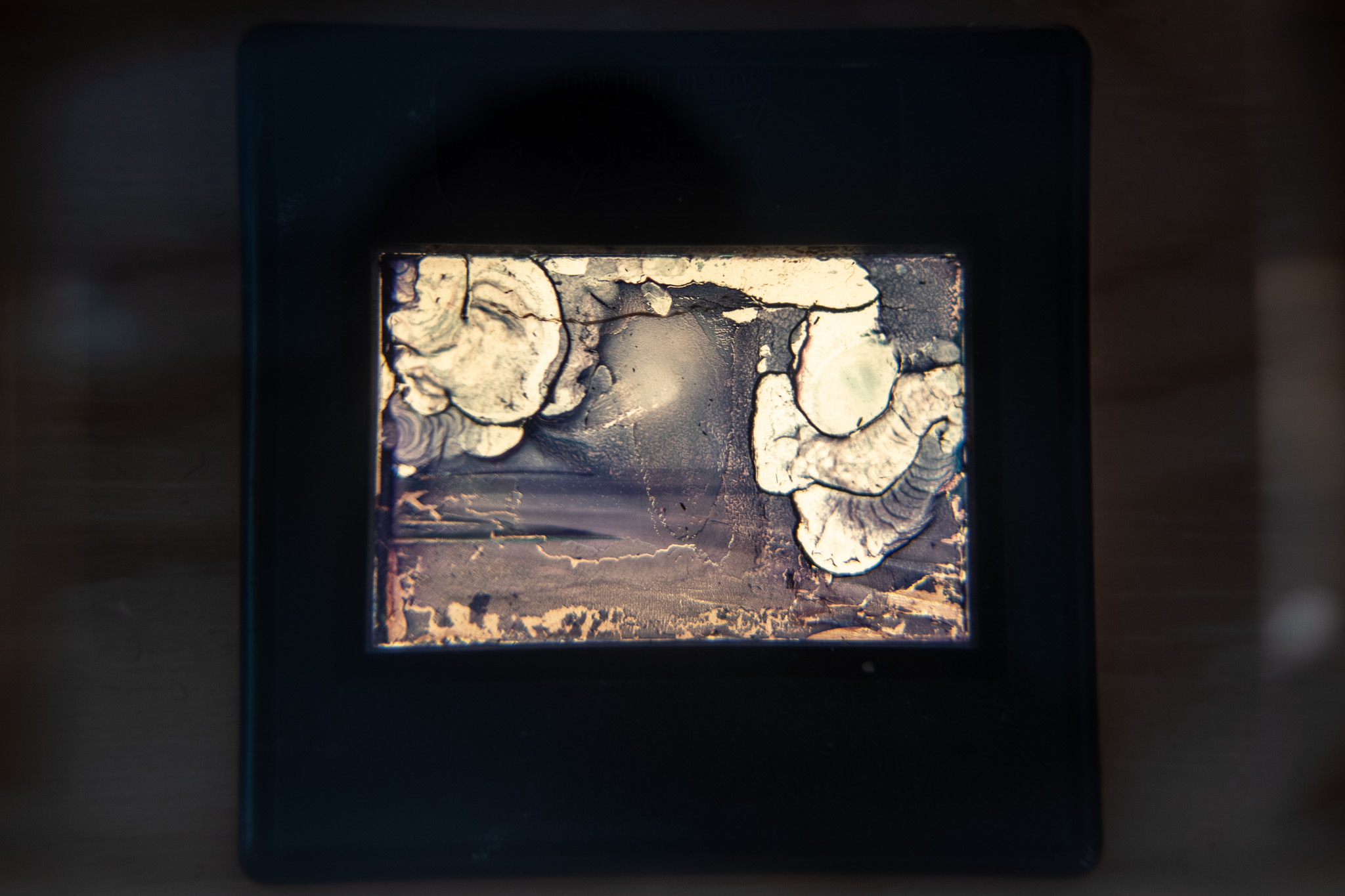 The Province of Liège acquired an edition of Amon nos autes. We created an object meant to be viewed up close, following the slide projections of the Biennale de l’image Possible, which were seen from a distance. A way of shifting perspective. Three slides are housed in a box designed as a handcrafted viewer, made in collaboration with cabinetmaker Ludovic Demarche, while five videos are screened alongside and extend the experience. The title of the work is engraved on the lid of the box, and on the back, a sentence spoken by one of the victims of the 2021 floods: “If we no longer have our memories, then we no longer have the troubles either.” A statement that reveals a certain state of mind encountered in the field. The slides open up fragments of stories, and the voices—mostly female—move through the images to recount transformation and the strength of the collective in the face of loss.