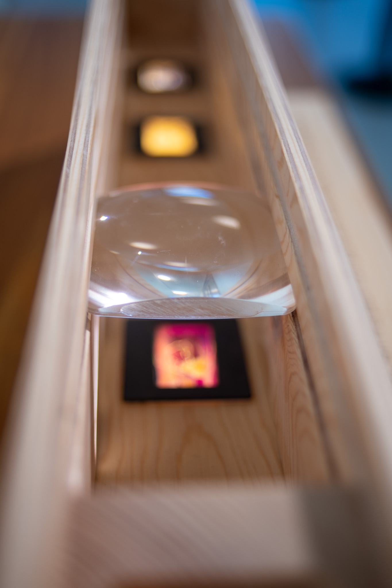 visionneuse artisanale, réalisée avec l'ébéniste Ludovic Demarche tandis que les cinq vidéos sont diffusées à côté et prolongent